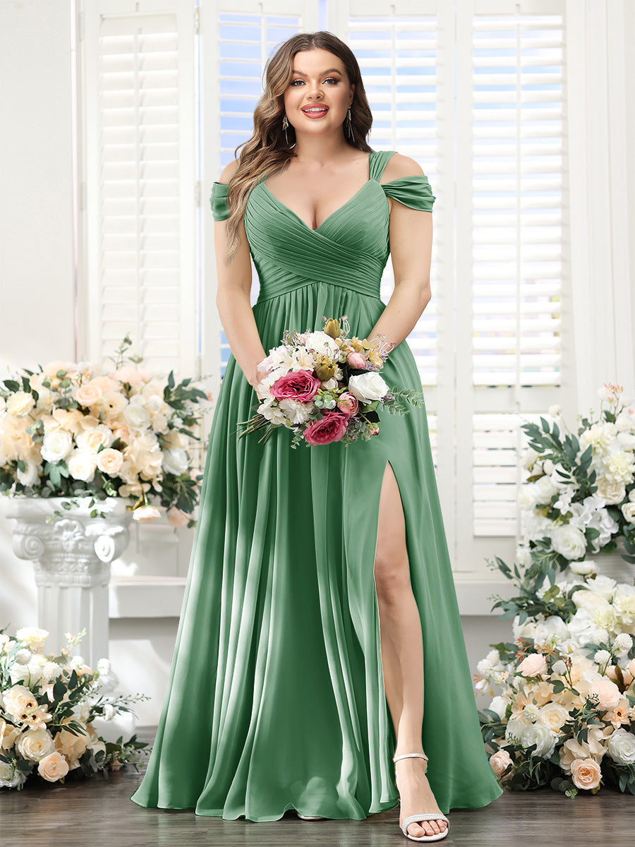 A-Line V-Neck Split Side Ruched Floor-Length Chiffon Plus Size Bridesmaid Dresses