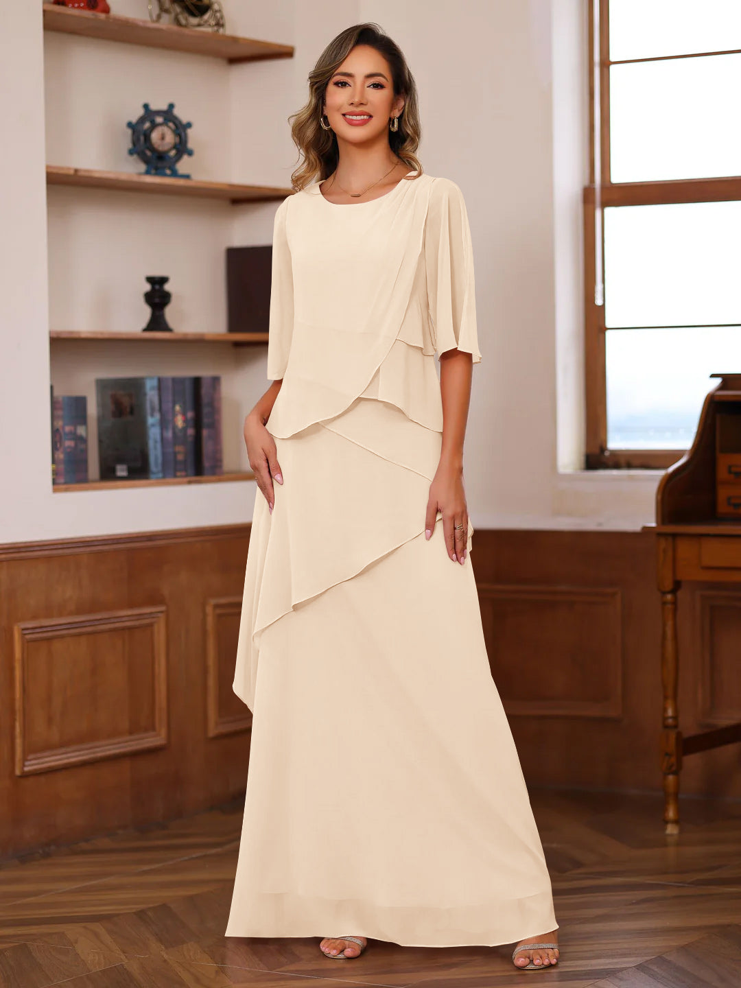 A-Line/Princess Scoop Neck Half Sleeves Floor-Length Mother of the Bride Dresses with Ruffles